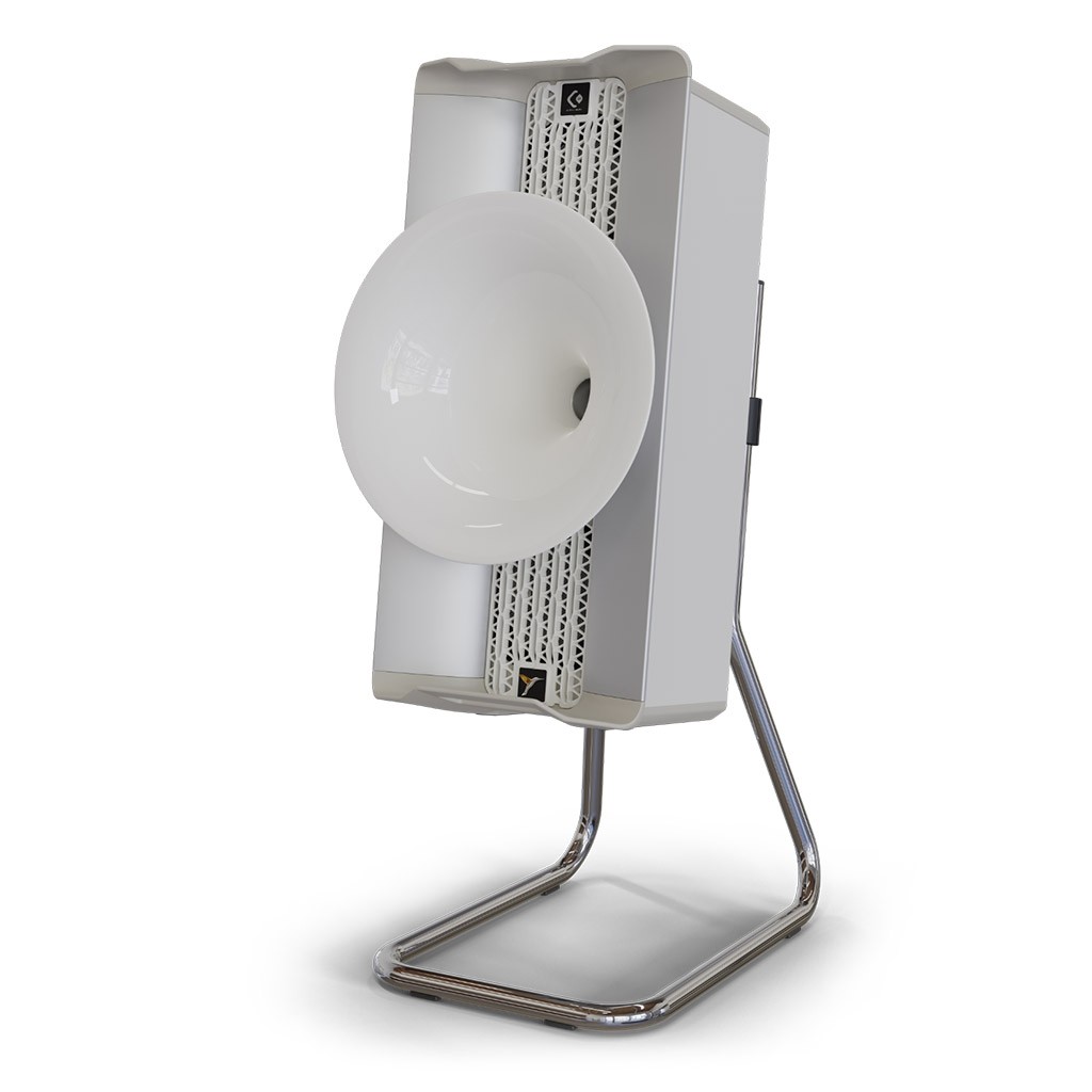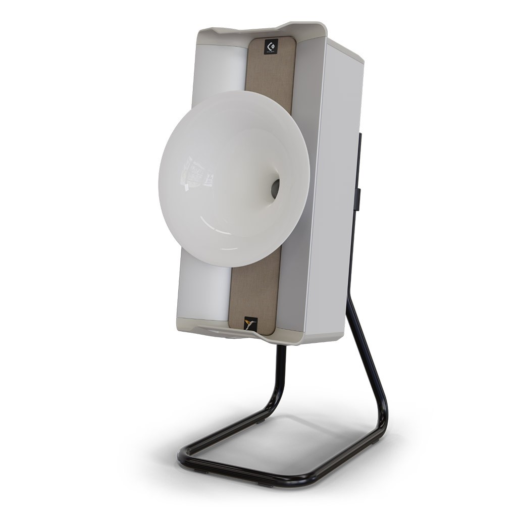 - finitura Grey-White: cabinet di colore bianco-grigio satinato, tromba sferica bianco laccata, top e base grigio satinato, gola della tromba in alluminio anodizzato argento, griglia ottagonale bianco laccata;