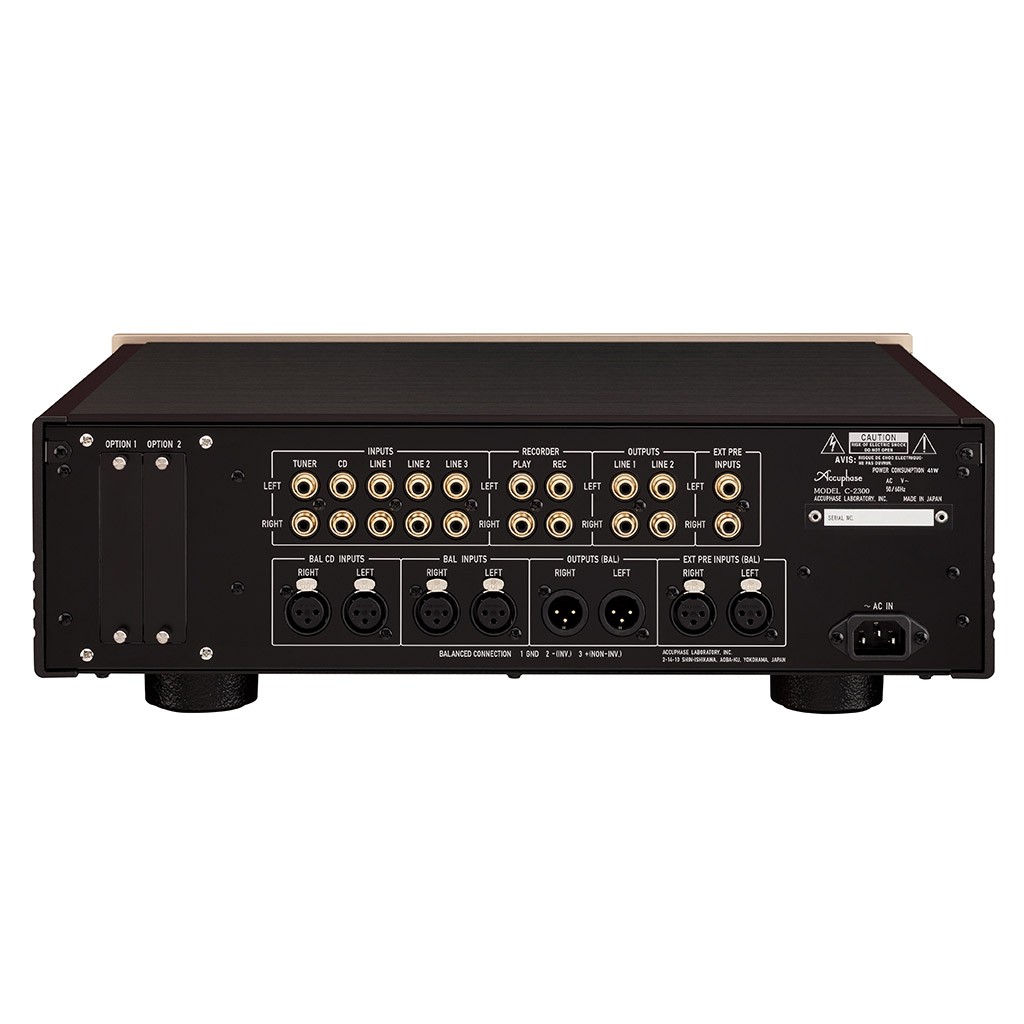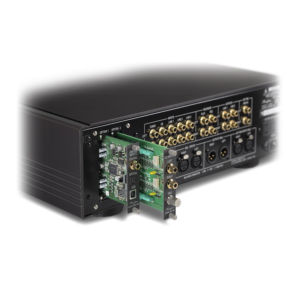 - 2x slot per schede Accuphase opzionali (Phono MC/MM, DAC, linea) con impostazioni gestibili mediante appositi comandi già integrati sul frontale;