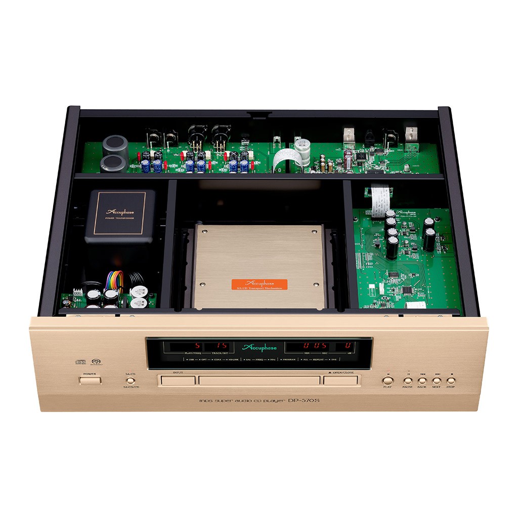 - sofisticata e robustissima meccanica proprietaria Accuphase, calibrata per delineare un baricentro molto basso, montata su una piastra inferiore a tre strati dotata di eccezionali capacità di smorzamento delle vibrazioni, con struttura sostenuta da isolatori in ghisa ad alto tenore di carbonio che inibiscono l'oscillazione dell'alloggiamento e riducono in modo significativo le vibrazioni esterne proiettate verso il meccanismo di estrazione dei dati, il cui gruppo ottico è sostenuto da smorzatori elastici in gomma speciale, nati da un'intensiva ricerca su forme e materiali, efficaci nel ridurre i fenomeni di risonanza a ridosso della lente di lettura e determinanti per garantire una lettura di precisione estrema;